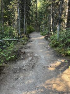 I got dropped off at my hotel in the early afternoon, and even though I was exhausted from not sleeping last night, I changed and went back outside to explore the town of Banff. Meandering around, I found myself by the railroad tracks, where I saw walking paths in the woods and along the river on the other side of the road. While walking towards the road, in the not-so-far-away distance, I saw a black bear run across it from my side and onto one of the paths on the other side where I was heading. Mind you, this road was busy, and no one seemed to bat an eye at this bear. Ignoring everything I know about bear safety, I sped up, keeping my eye on where it went.